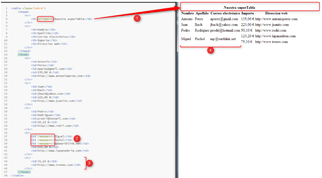 En (2), podéis ver el uso de «rowspan» para hacer que las tres primeras celdas, ocupen dos filas; como consecuencia, veis en (3), que esa fila colo tiene 2 celdas, ya que las otras tres columnas, estan definidas en el «tr» anterior.