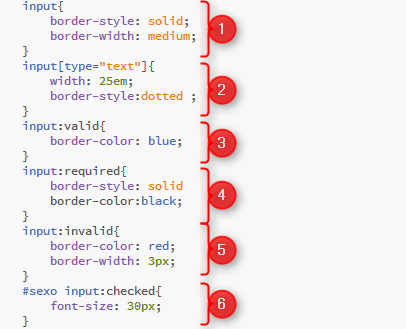 y a continuación, defino como sera un elemento «input». Recordad que en CSS, cuando un elemento recibe distintos valores para una especificación, se aplica la ultima; eso significa que el orden en que escribamos las reglas, afectara; sobre todo en este caso que habrá mas de una regla para el mismo componente.