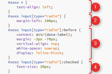 - Indico que cualquier «input» de tipo «radio» que haya, deje un margen a la izquierda de 100 px, esto lo hago para luego tener espacio para dejar caer el texto