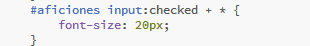 - Y si todo lo anterior lo tenéis claro, esto es lo sencillo; defino una regla que servirá para el «input» marcado (checked) y lo que hace es aumentar en tamaño del fuente correspondiente