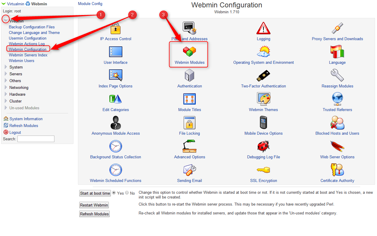 Ahora debemos incorporar el modulo de control al «webmin«, para simplificar nuestra gestión; para ello, no conectamos, con un navegador web a nuestro Virtualmin