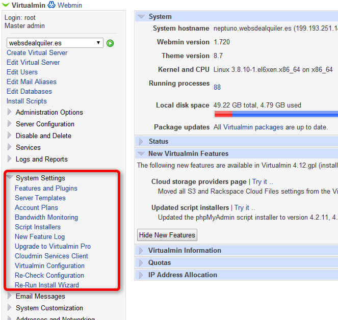 En este apartado tenemos la posibilidad de enlazar nuestro Virtualmin con una cuenta de Cloudmin y asi externalizar la gestión de DNS, Databases, Filtros de Spam, antivirus,….