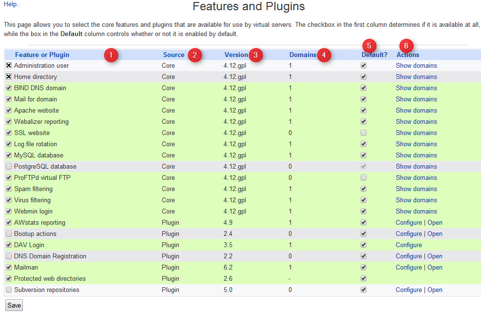 - Indica si la característica la aporta el paquete Virtualmin o se ha añadido con un plugin.