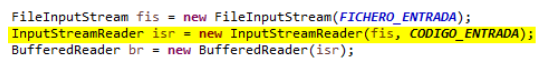 Como podéis imaginar, en FICHERO_ENTRADA y FICHERO_SALIDA son dos Strings con los nombres de fichero, mientras que CODIGO_ENTRADA Y CODIGO_SALIDA son los códigos como UTF-8 o ASCII