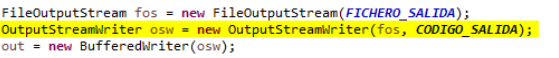 De la 27 a la 29, abrimos el fichero de entrada, indicándole la codificación y añadiendo el BufferedReader y de la 31 a la 33, abrimos el de salida, añadiéndole también el BufferedReader
