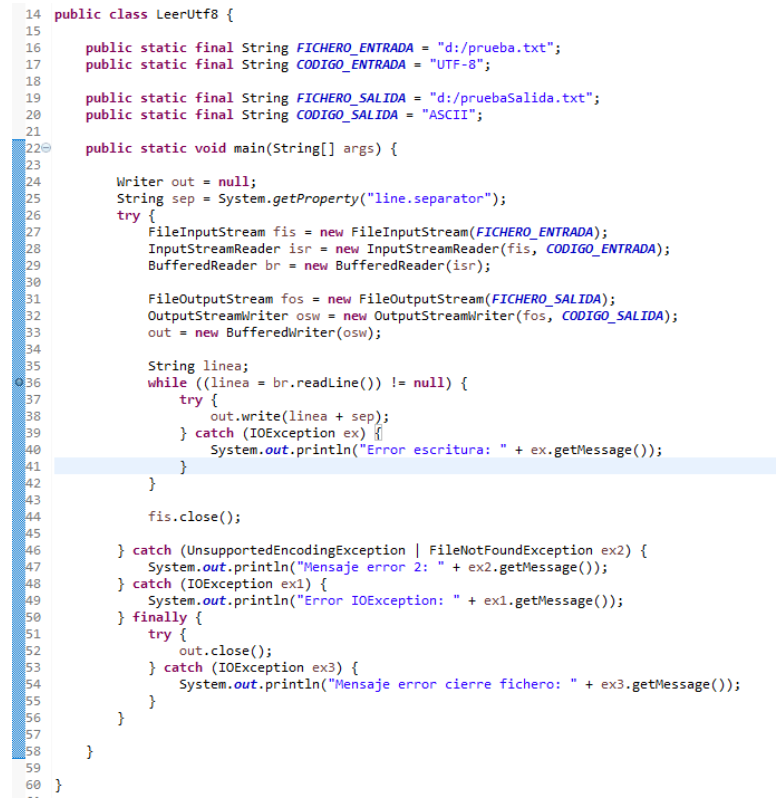 De la 27 a la 29, abrimos el fichero de entrada, indicándole la codificación y añadiendo el BufferedReader y de la 31 a la 33, abrimos el de salida, añadiéndole también el BufferedReader