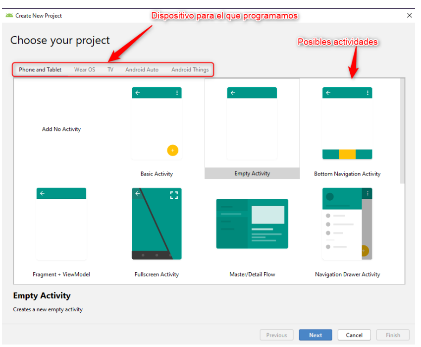 Sin embargo, y para este primer intento, escogeremos la Actividad vacía
