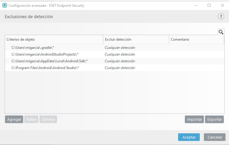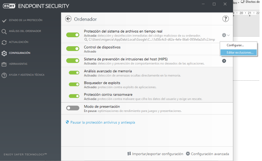 Para no deshabilitar totalmente el antivirus, podemos hacer que no supervise los siguientes directorios