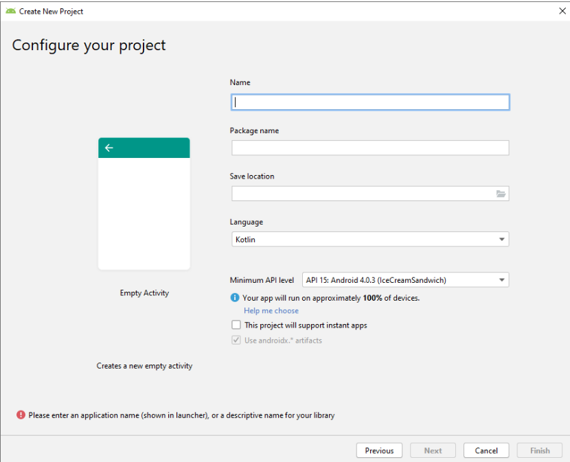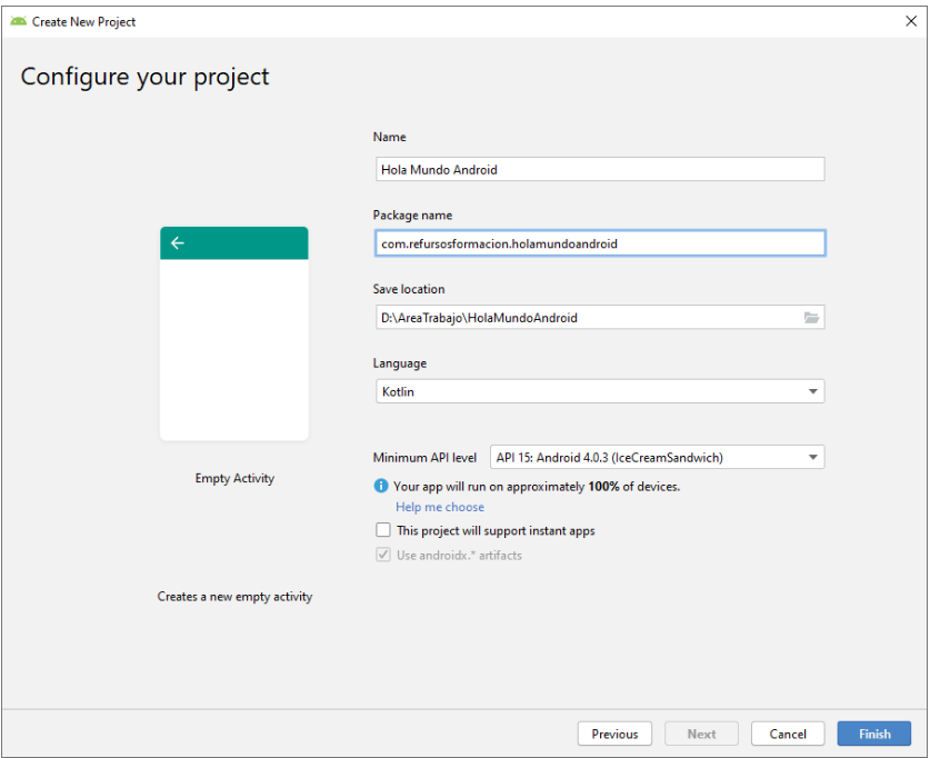 - El proyecto soporta “instant apps” – Indica que es posible utilizar partes del proyecto sin instalar. De momento, dejaremos esta posibilidad sin marcar, ya que trabajar con esta premisa modifica nuestro diseño.