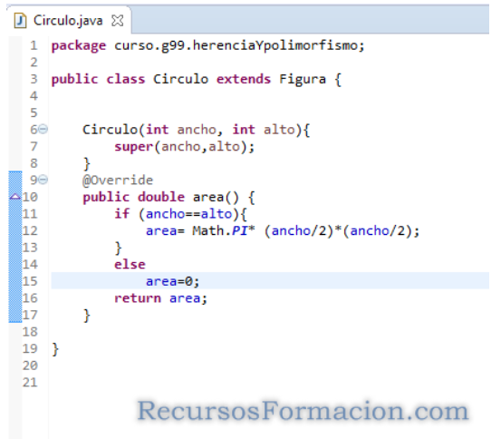 Creamos la clase Circulo, heredando nuevamente de Figura, y escribimos la nueva fórmula del área; esta vez, un circulo, y como recibimos ancho y alto, podemos comprobar que son iguales, si no, deberíamos implementar el área de la elipse; de momento con un cero, basta