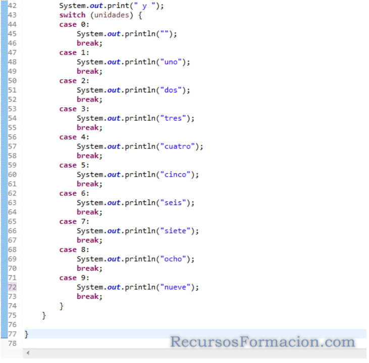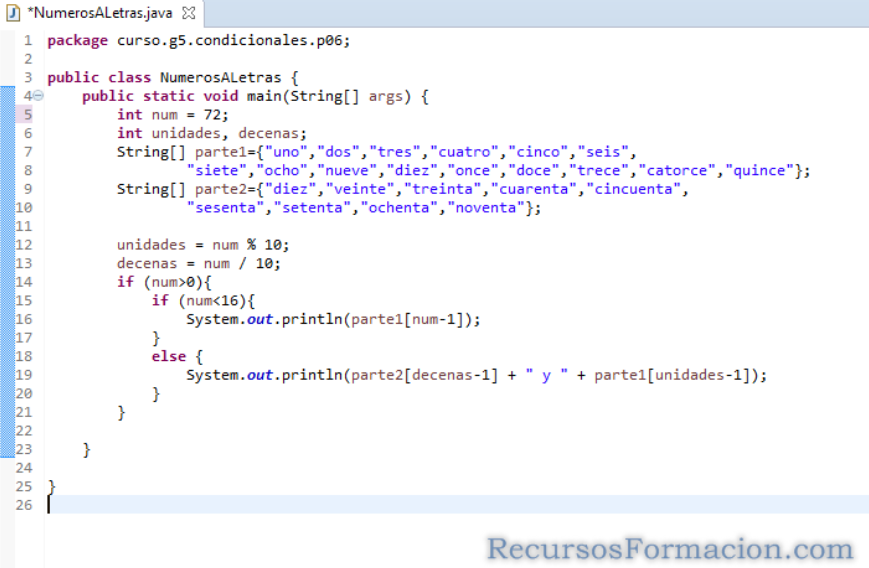 Para este ejercicio, nos solicitan que hagamos una clase que pueda traducir números a letras en el rango de 1 a 99, con dos versiones, una sencilla que no tiene en cuenta la diferencia que existe entre los números 11 a 15, y otra un poco mas elaborada para los convierta correctamente.