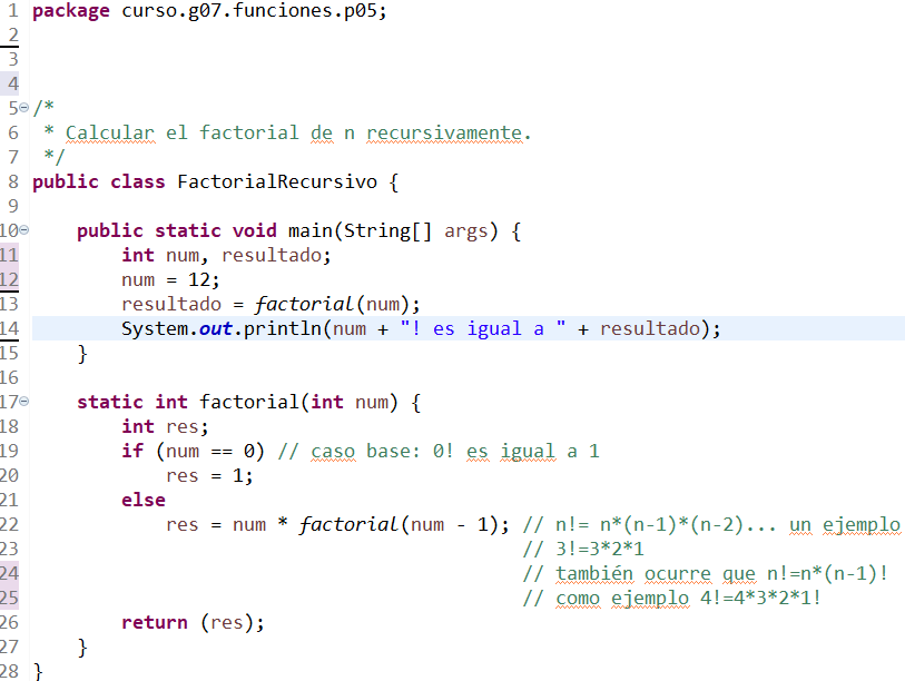 Naturalmente, necesito un poco de código para preparar la llamada, luego una sola llamada al método factorial (linea 13), nos resuelve el trabajo. Daros cuenta que en un momento se llama a factorial (linea 22) tantas veces como sea necesario, y luego se van recogiendo sus respuestas