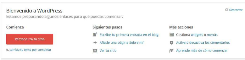 Pantalla de bienvenida, nos ofrece una forma rápida de empezar a trabajar con WordPress, ya que concentra la mayoría de funcionalidades que necesitaremos para poder iniciar nuestro blog:
