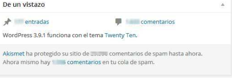 Nos ofrece el número de entradas escritas, el número de comentarios recibidos, y en la parte de abajo, en mi caso, me ofrece información acerca de los comentarios de Spam bloqueados, y los que están pendientes de verificación. Esto me lo facilita «Akismet», un plugin que veremos mas adelante. Si estas en WordPress.com, te indica también el espacio disponible que tienes y el consumido