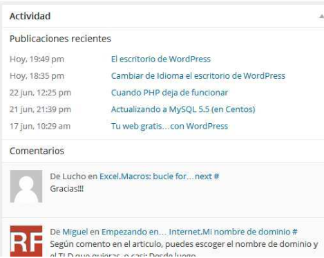 Nos facilita información acerca de los últimos artículos publicados, los comentarios recibidos, los aprobados, los pendientes de aprobar, los enviados a la papelera o los que están en la cola de Spam