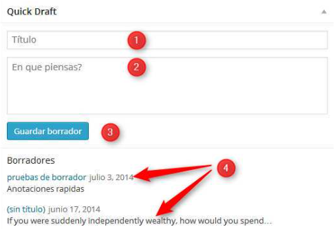 Esta caja, nos permite hacer anotaciones rápidas que serán guardadas como borradores, osea que no se publicarán, en cualquier momento, podemos revisar la lista de borradores marcados que aparecen en este mismo cuadro, o por medio de la opción de menú «Todas las entradas.
