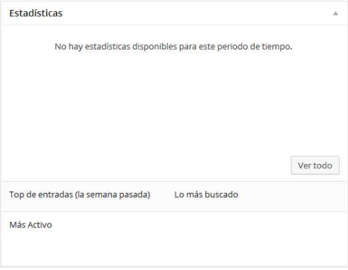 Este cuadro nos ofrece las estadísticas de acceso a nuestro blog, detallado día a día, Si habéis instalado WordPress en un servidor vuestro, este cuadro no aparecerá hasta que instaléis el plugin «JetPack» cosa que haremos mas adelante