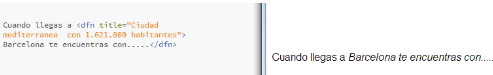 | < dfn > | Esta etiqueta la utilizaremos para definir un término. La definición, estará en el atributo «title» si existe, y si no, en el contenido circundante.![]() |