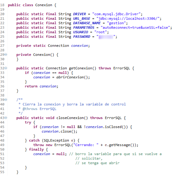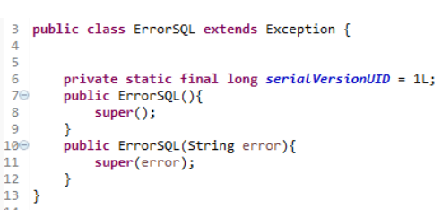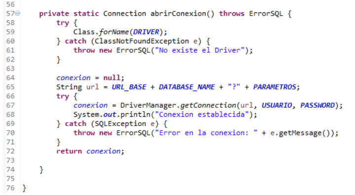 Por último, el método abrirConexion es muy semejante al escrito anteriormente, pero interceptando los errores, para devolverlo como ErrorSQL