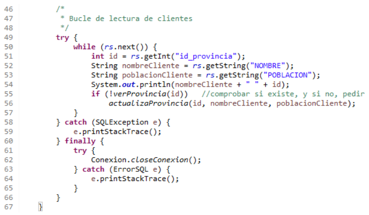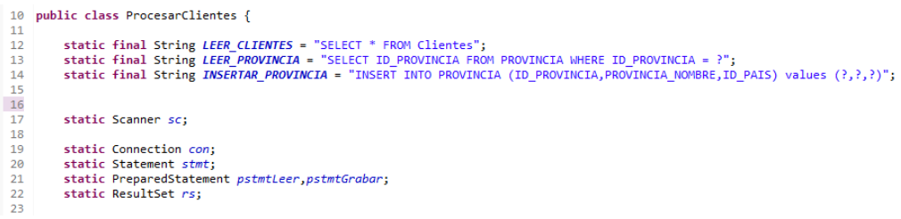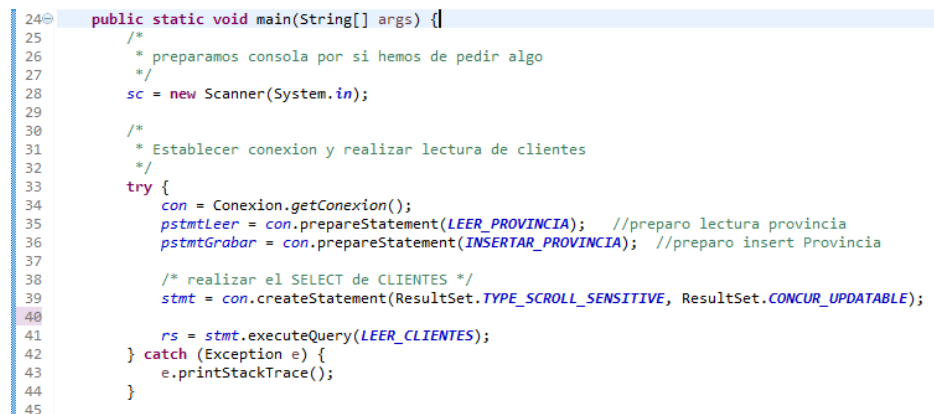 Abrimos Scanner sobre la consola para poder pedir datos (28), solicitamos una conexión (34), cargamos los PreparedStatement para leer provincias e insertarlas (35,36) y realizamos el SELECT sobre clientes consiguiendo el ResultSet (39,41)